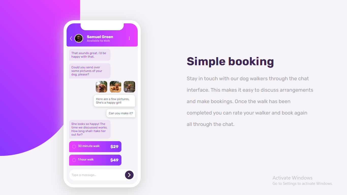 A landing page for the chat section of a dog-walking application. P.S: the phone isn't a picture. :)